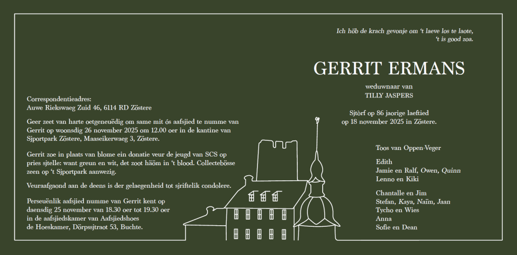 Op woensdag 26 november om 12.00 zal een dienst worden gehouden om afscheid te nemen van Gerrit Ermans. Op speciaal verzoek van de familie (en met goedkeuring van Gerrit) zal deze dienst plaatsvinden in de kantine van Sportclub Susteren, Maaseikerweg 3 te Susteren.